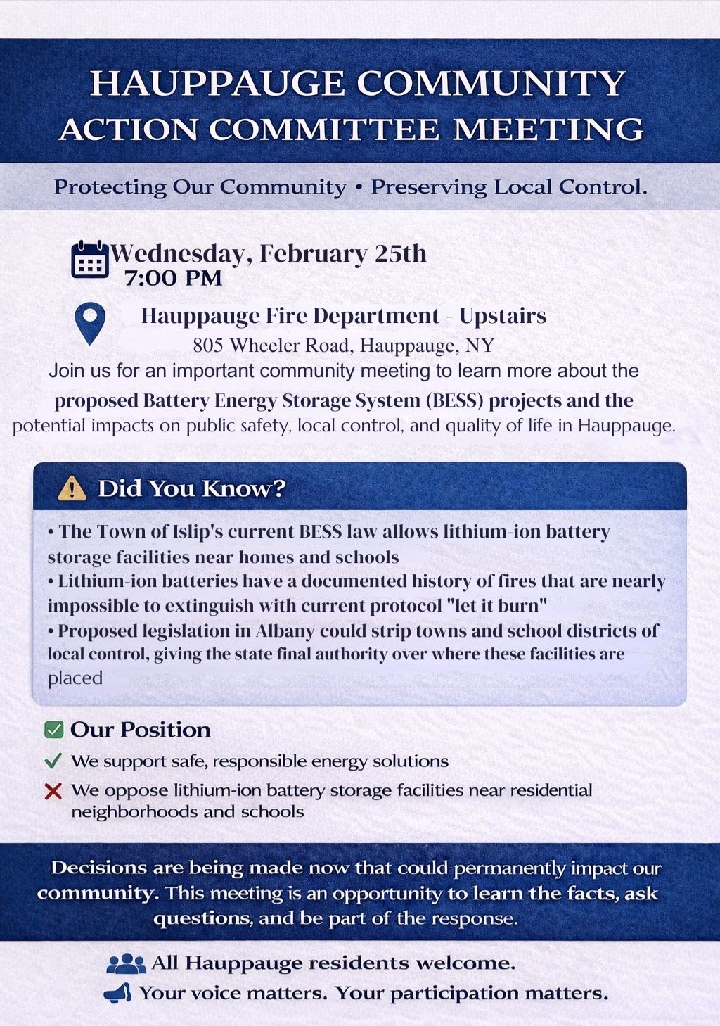 If these bills pass, Hauppauge will lose the ability to say NO to massive industrial battery facilities — including the proposed lithium-ion BESS near our schools, homes, and fire districts.