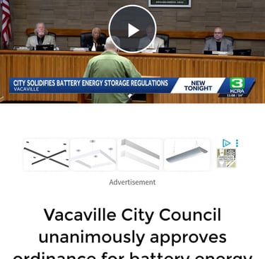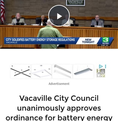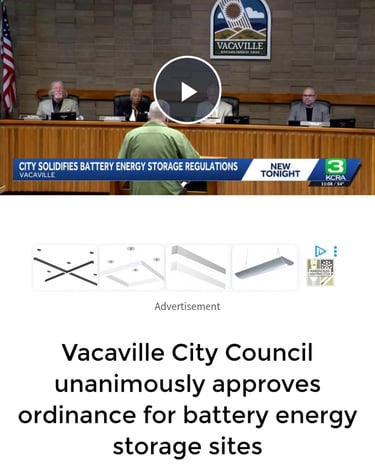 In March 2026, the Vacaville, California City Council unanimously approved a new ordinance regulating BESS facilities following community safety concerns and public discussion.